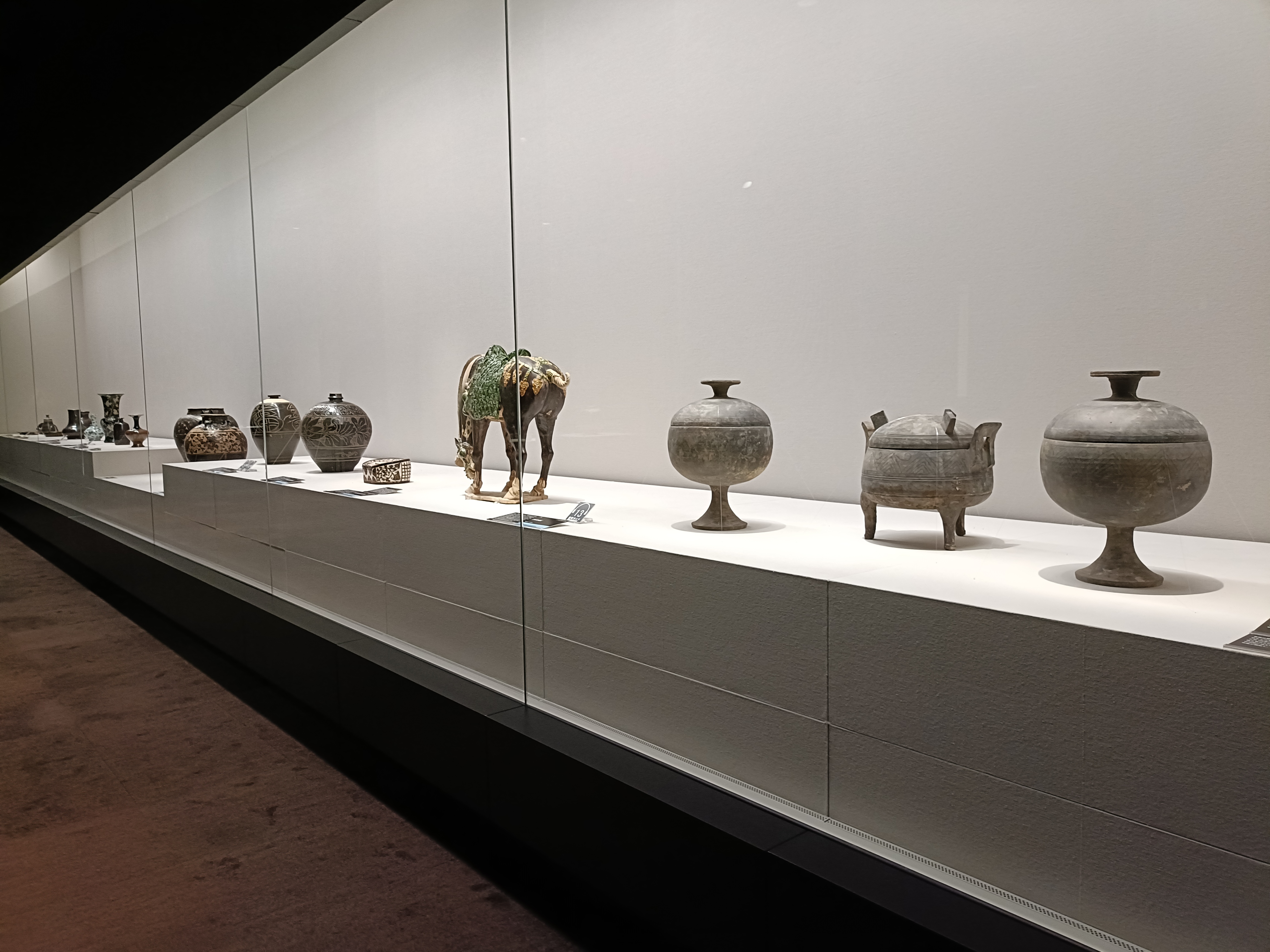 「3章 天⽬と黒いやきもの」展⽰⾵景より、磁州窯と磁州窯系のやきものの展⽰