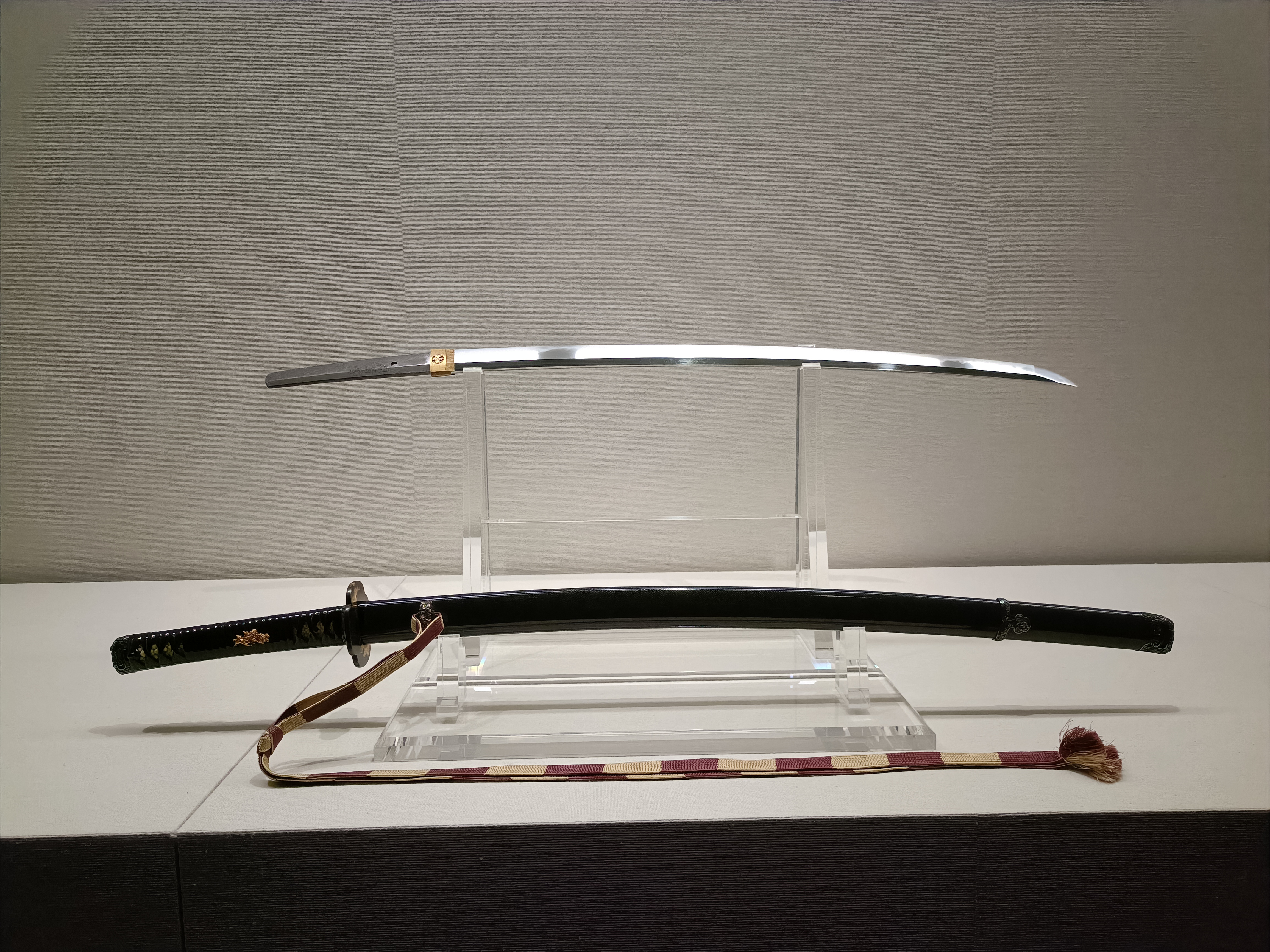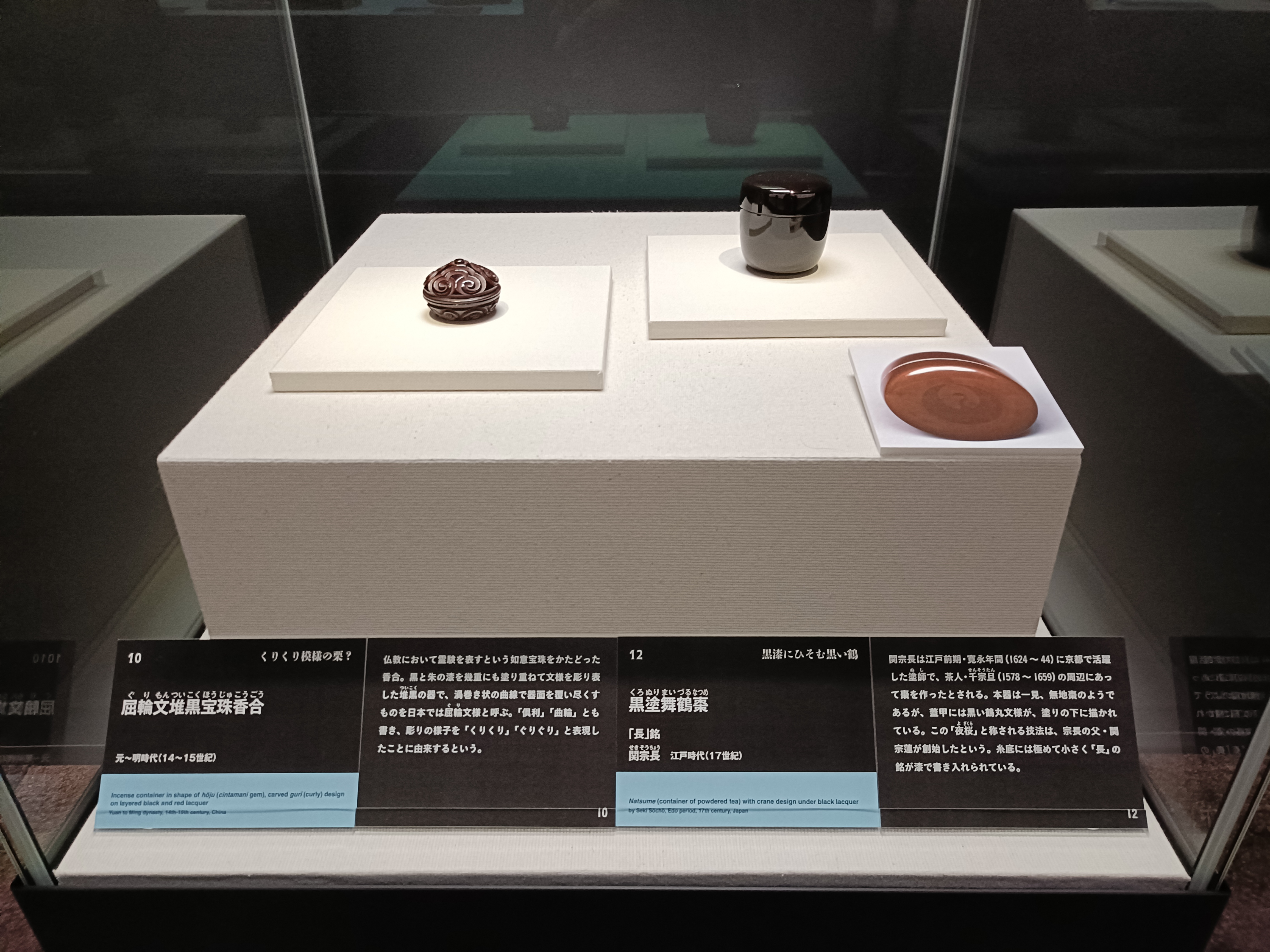 第2展示室では、漆工芸品や刀剣など、さまざまな黒い工芸品が展示されています。漆黒の艶やかな光沢や、刀剣の力強い輝きなど、素材や技法によって異なる「黒」の表情の違いを⾒ることができます。