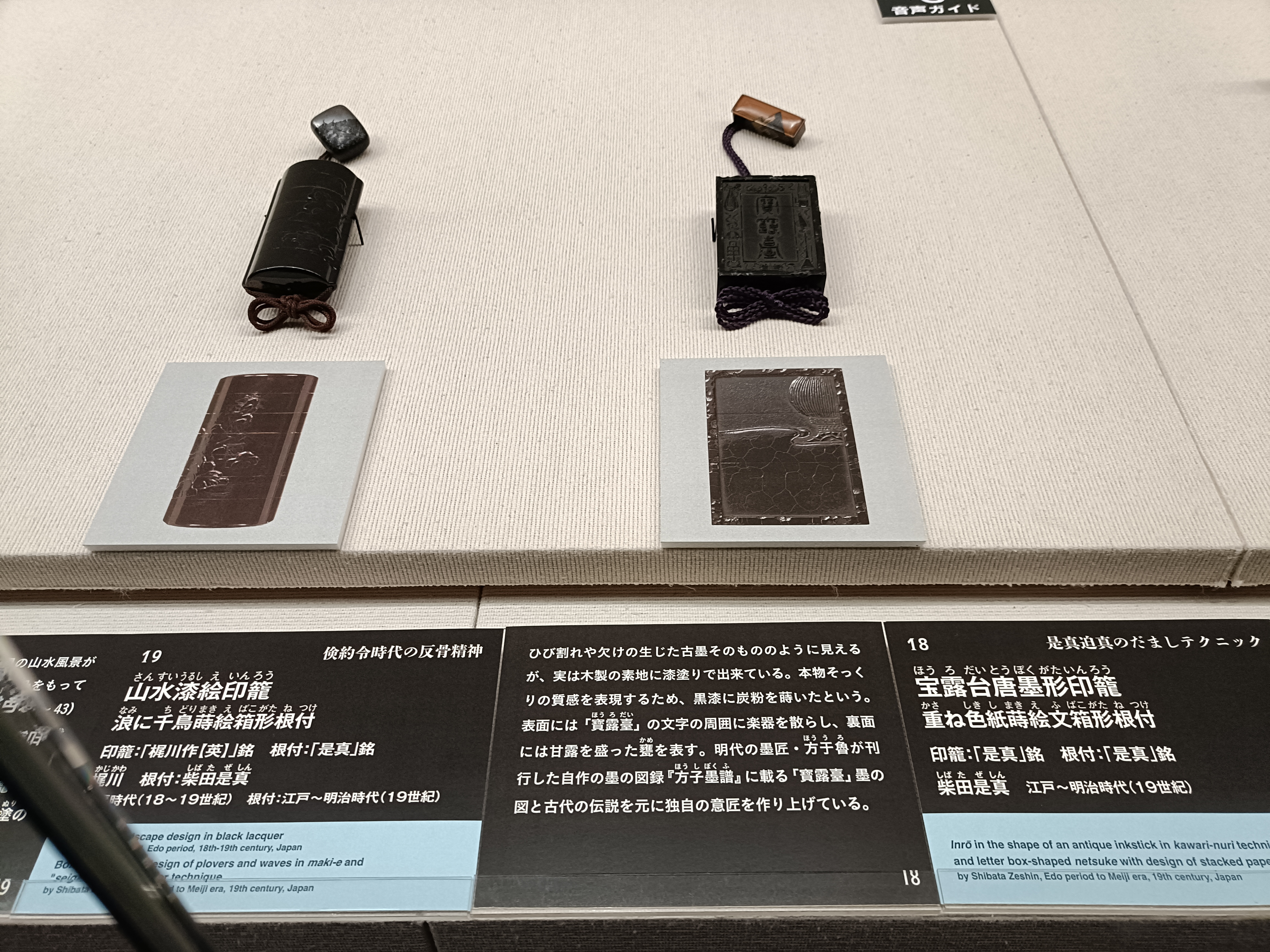 柴田是真の《宝露台唐墨形印籠》は、古い墨のように見える精巧な漆器です。黒漆に炭の粉を蒔き、古墨の質感をリアルに表現しています。そこには、是真の緻密な技と遊び心が感じられます。