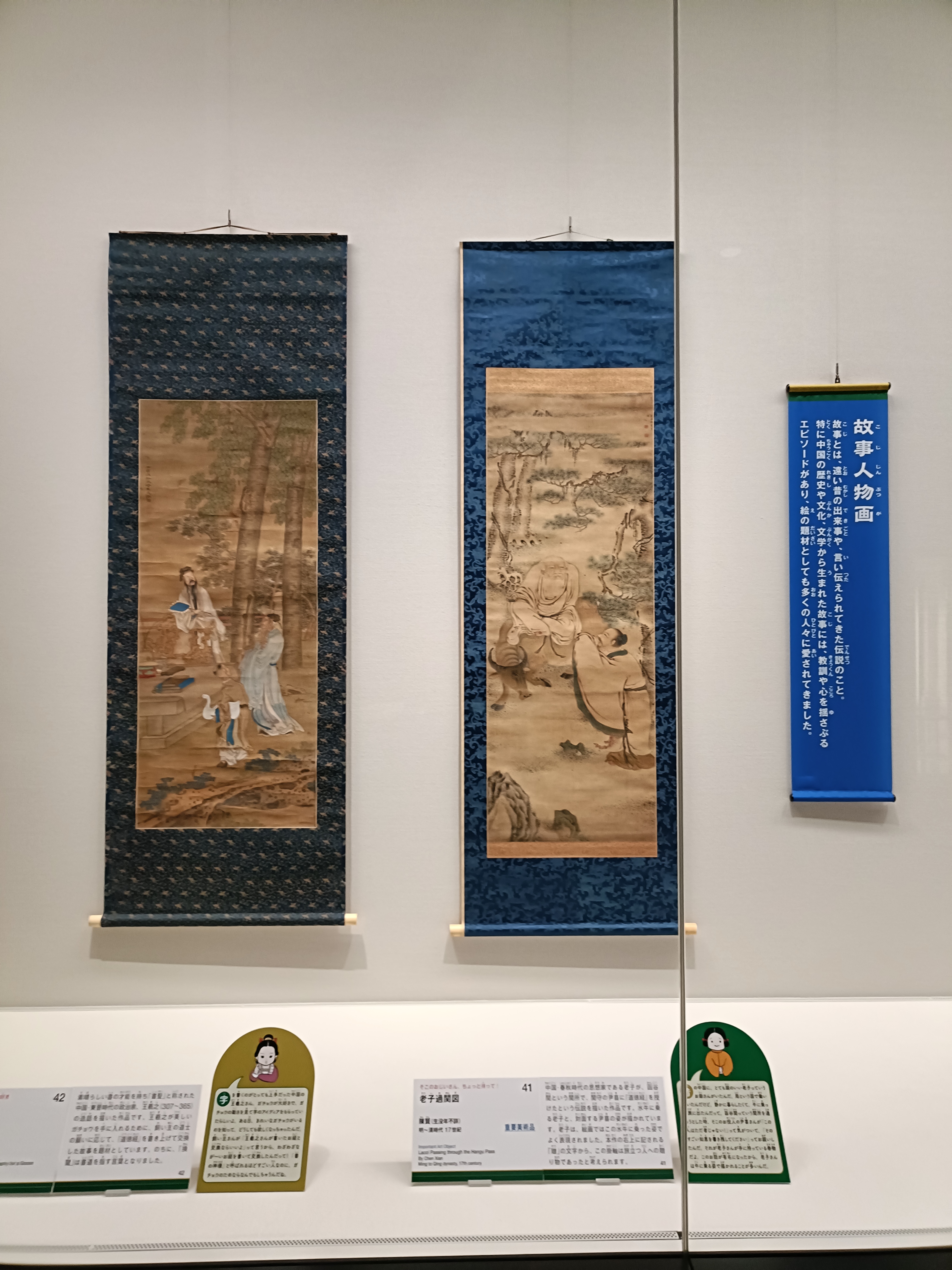 第3章「道釈画と故事人物画」展示風景より、(左から)《王右軍換鵞図》馬元欽 清時代・康煕元年(1662)、【重要美術品】《老子過関図》陳賢 明~清時代・17世紀