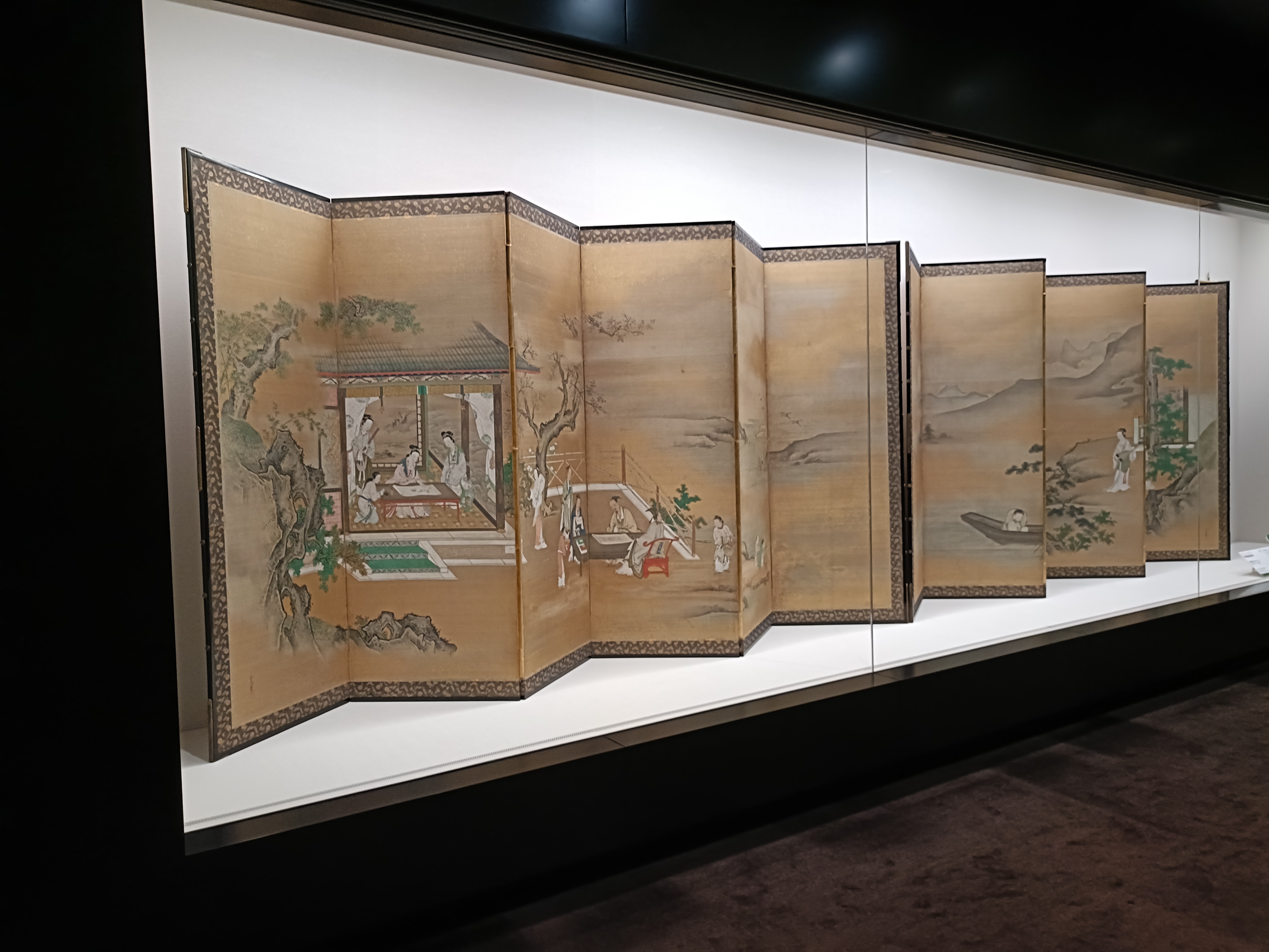 《琴棋書画図屏風》では、中国の知識階級が身につけるべきとされた4つの教養「琴・囲碁・書・画」を楽しむ人々の姿が、理想的なかたちで描かれています。