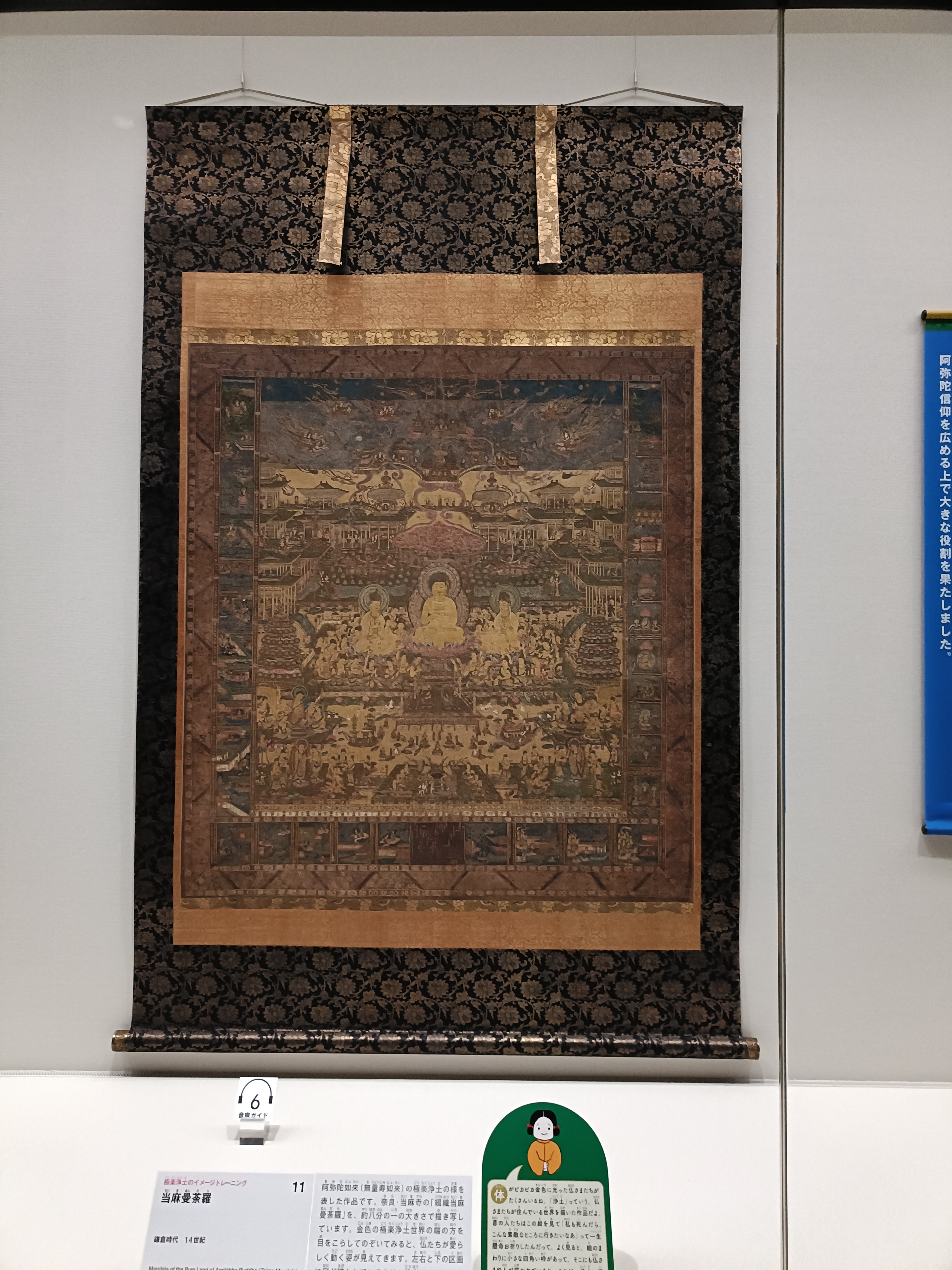 また、極楽往生を願う人々の間で篤く信仰されたのが、《当麻曼荼羅》です。中央には阿弥陀如来が住まう西方極楽浄土の様子が、壮麗かつ具体的に描かれ、これを目にした人々に「あそこへ行きたい」という憧れを抱かせ、信仰心をいっそう深める役割を果たしてきました。