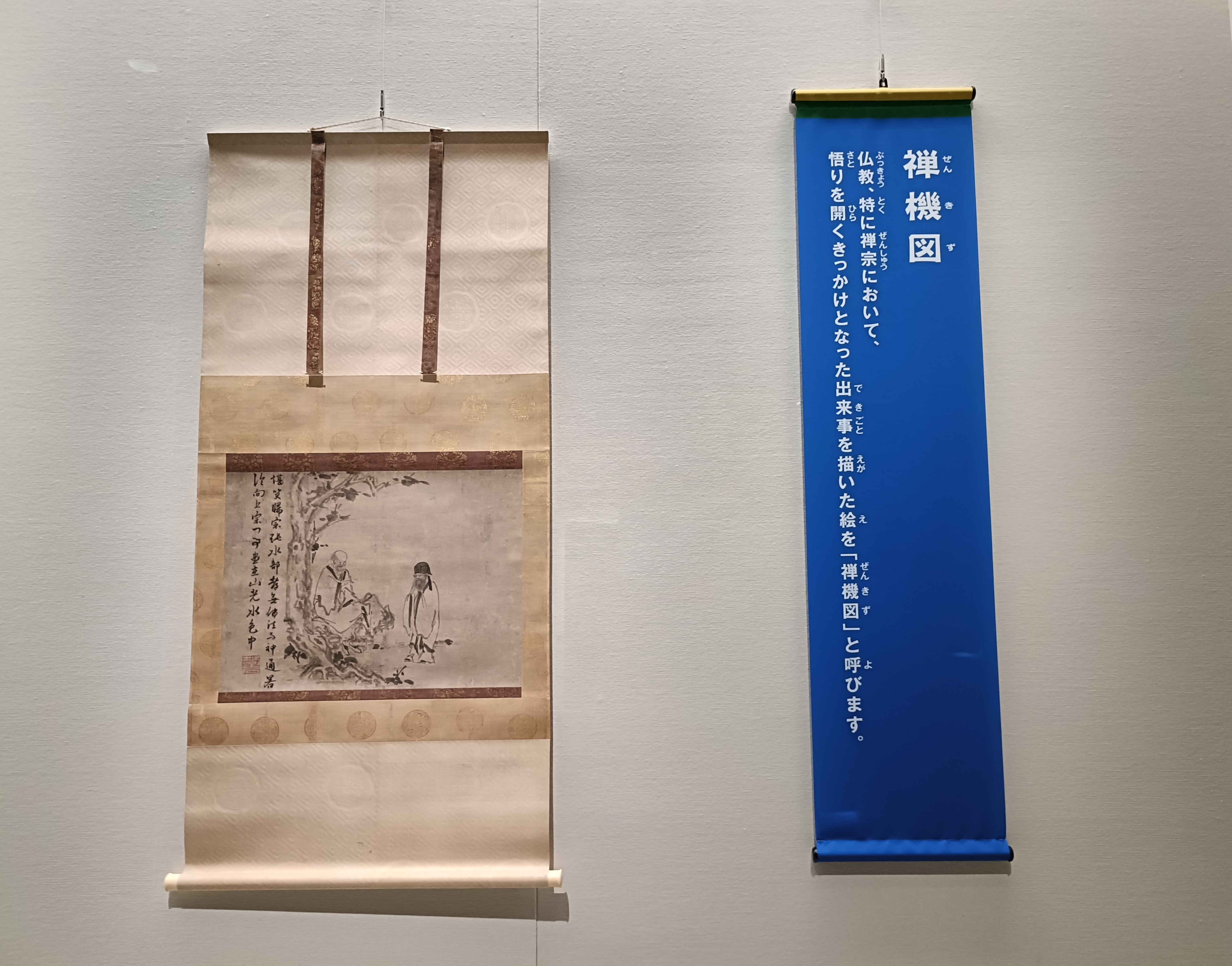これは悟りを開くきっかけを描いた「禅機図」と呼ばれる絵画で、樹の下に座る高僧・帰宗智常が、教えを乞いに来た張水部に、右手で進むべき道を指し示しています。