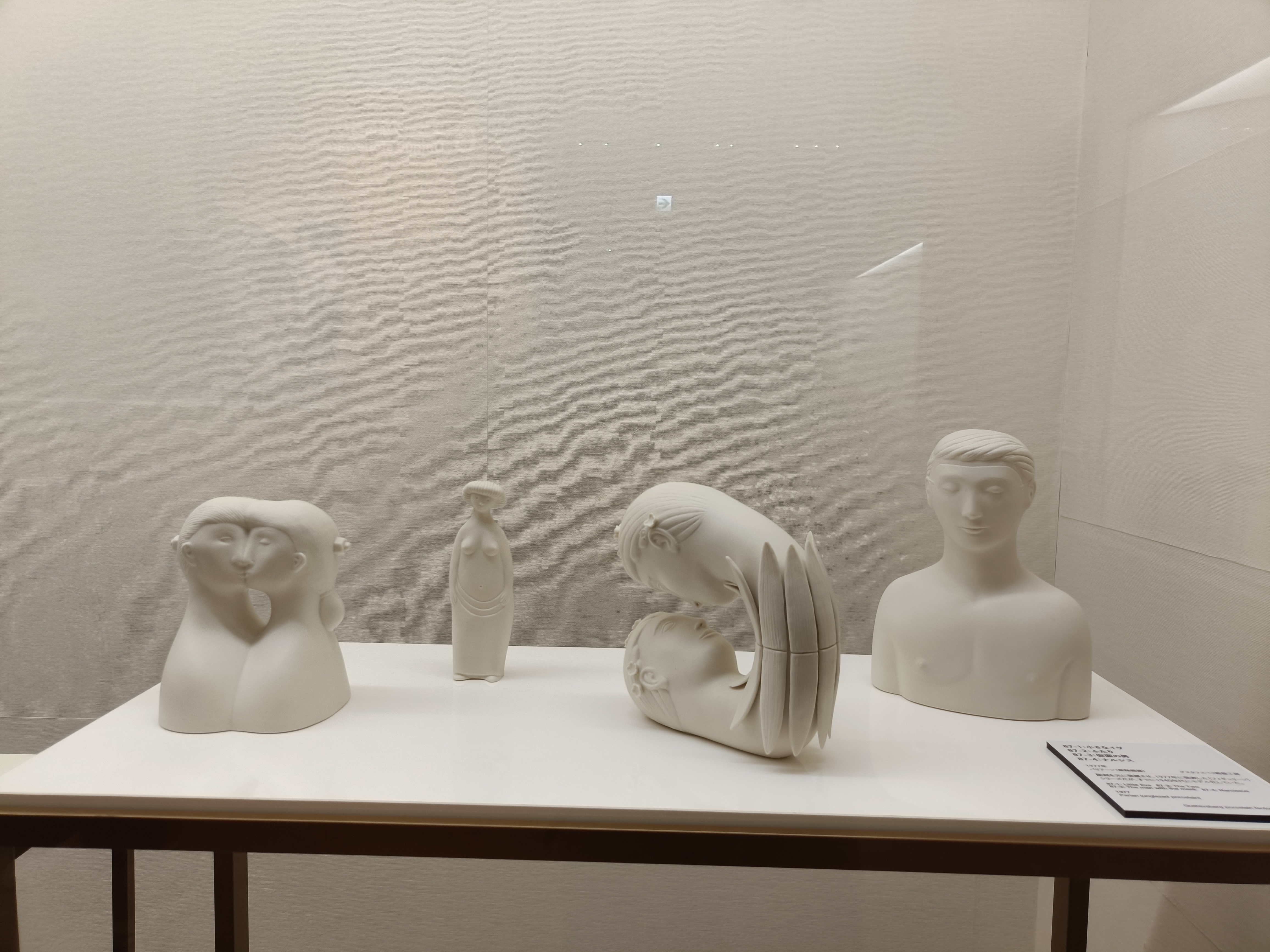 「第5章 フィギュリン(人物と動物)」展示風景より、バリアーン(無釉磁器)の作品 (左から)《ふたり》、《小さなイブ》、《ナルシス》、《仮面の男》 いずれもスティグ・リンドベリ、グスタフスベリ磁器工房
