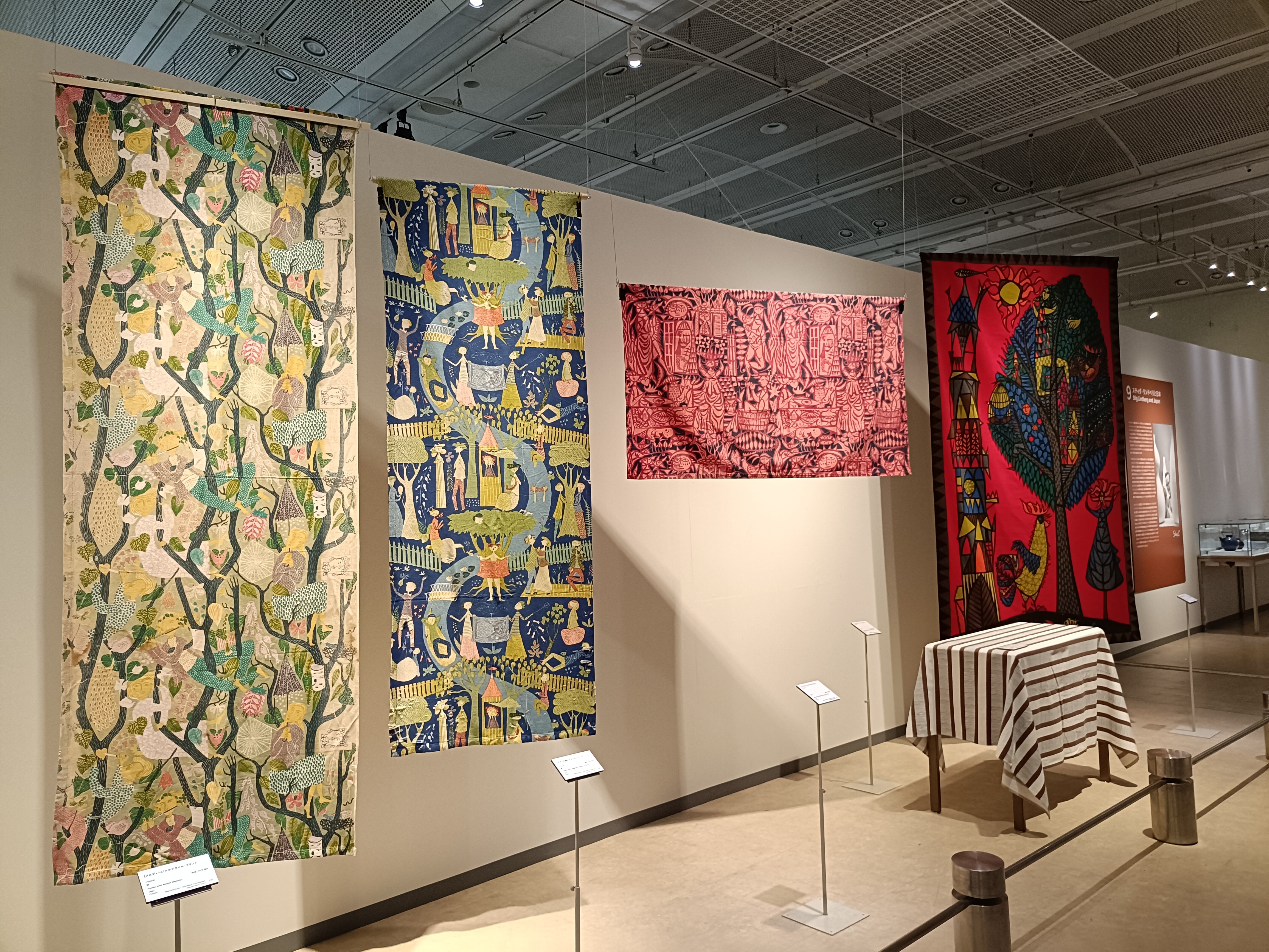 これらの仕事の背景には、テキスタイルデザイナーであった妻グンネルの存在がありました。彼女が、リンドベリのデザインを基に手織りしたタペストリーも展示されています。