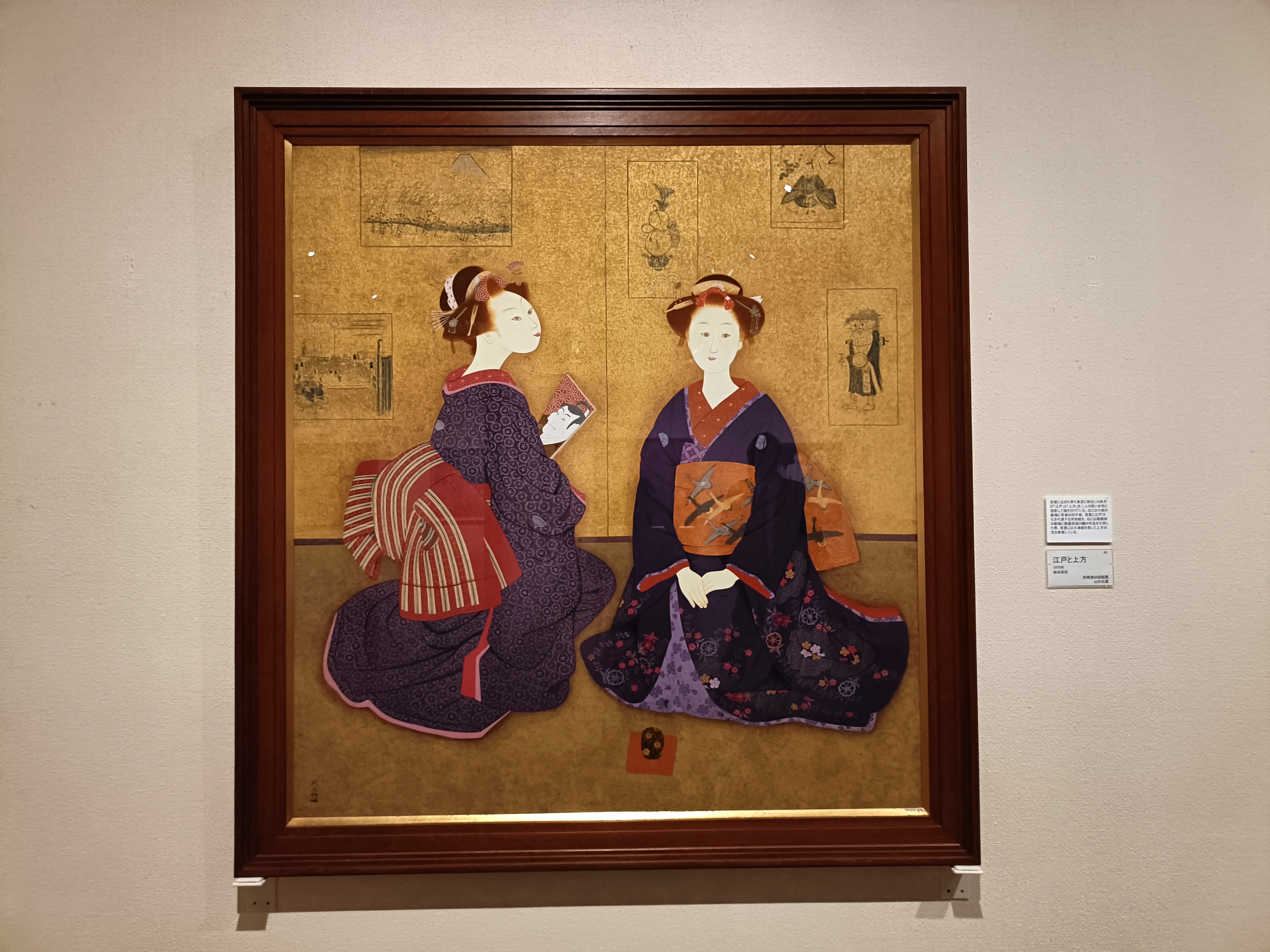 《江戸と上方》では、江戸と上方の文化的な差異を二人の女性に託し、その気質の違いを表情や姿、背景のモチーフで象徴的に描き出しています。