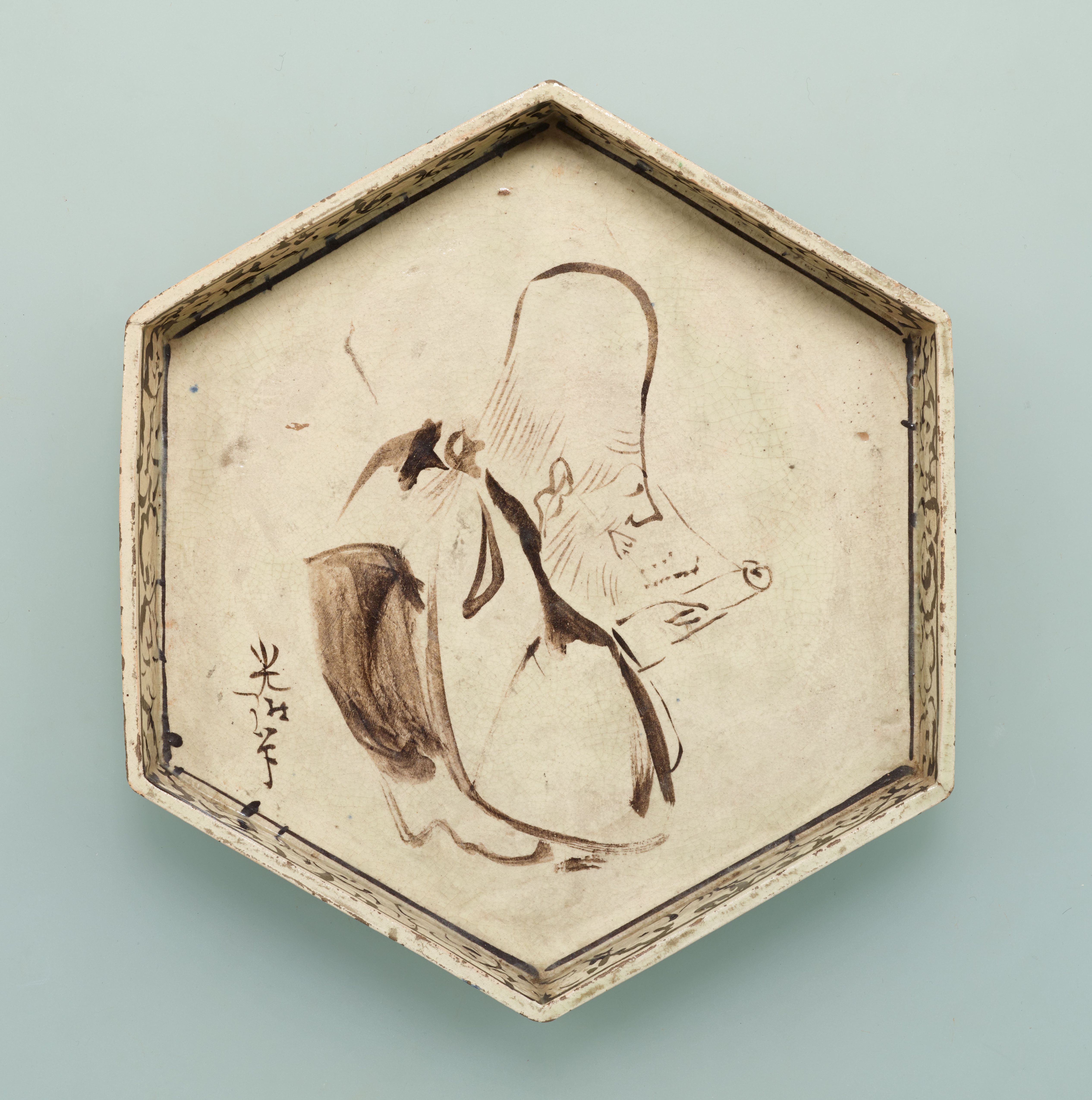 重要文化財《銹絵寿老図六角皿》尾形乾山作、尾形光琳絵付 江戸時代・18 世紀 大倉集古館蔵
