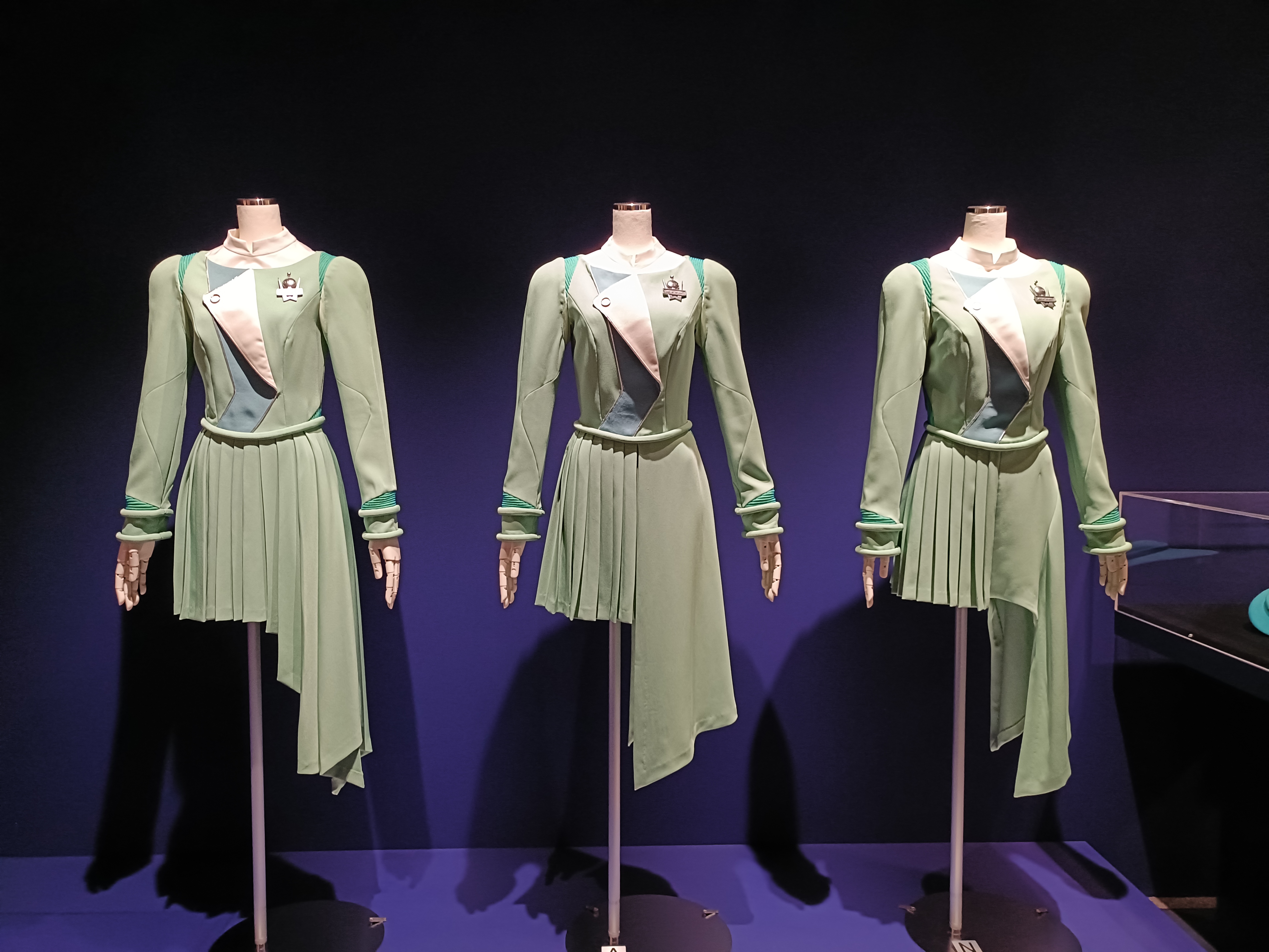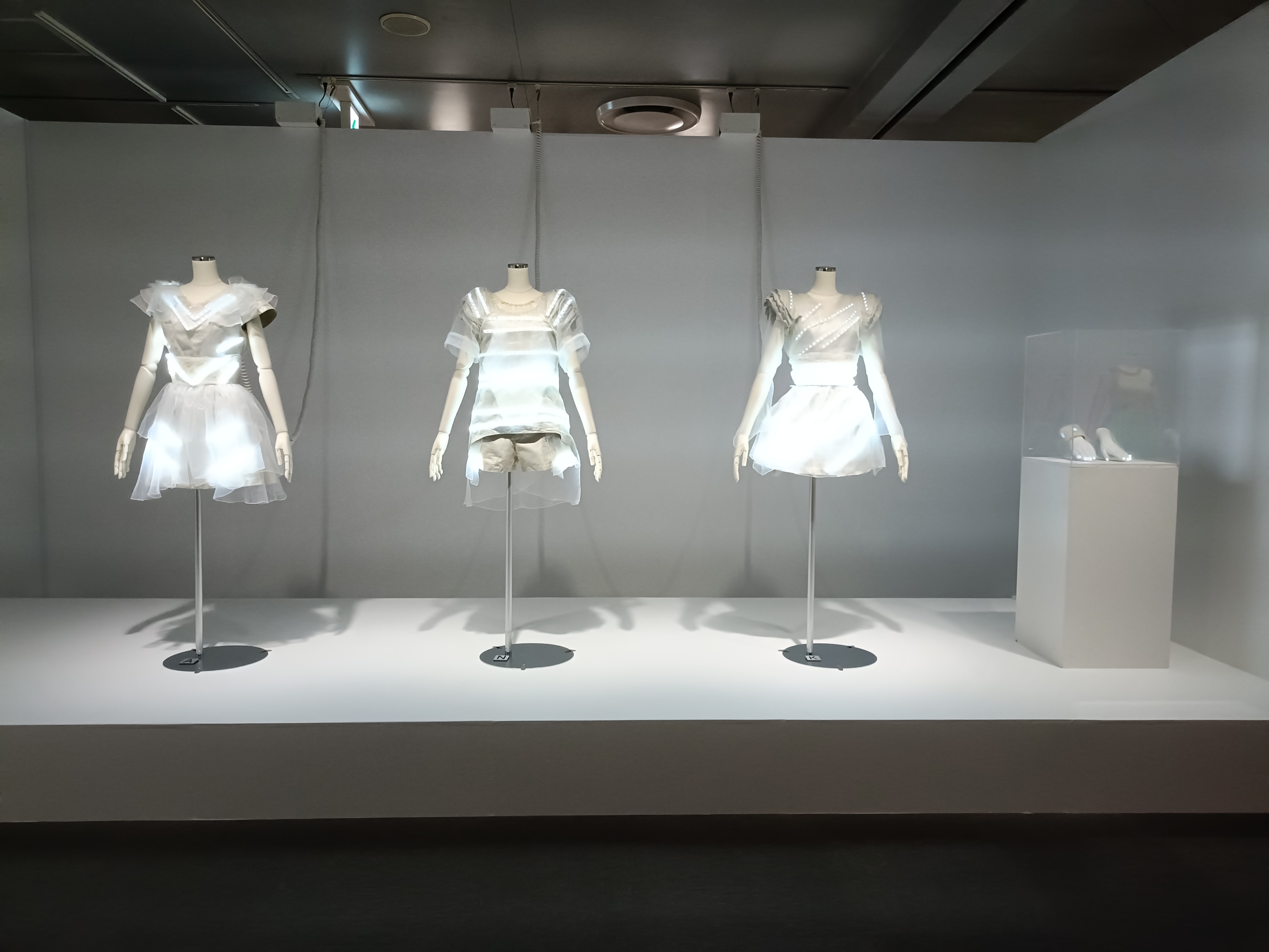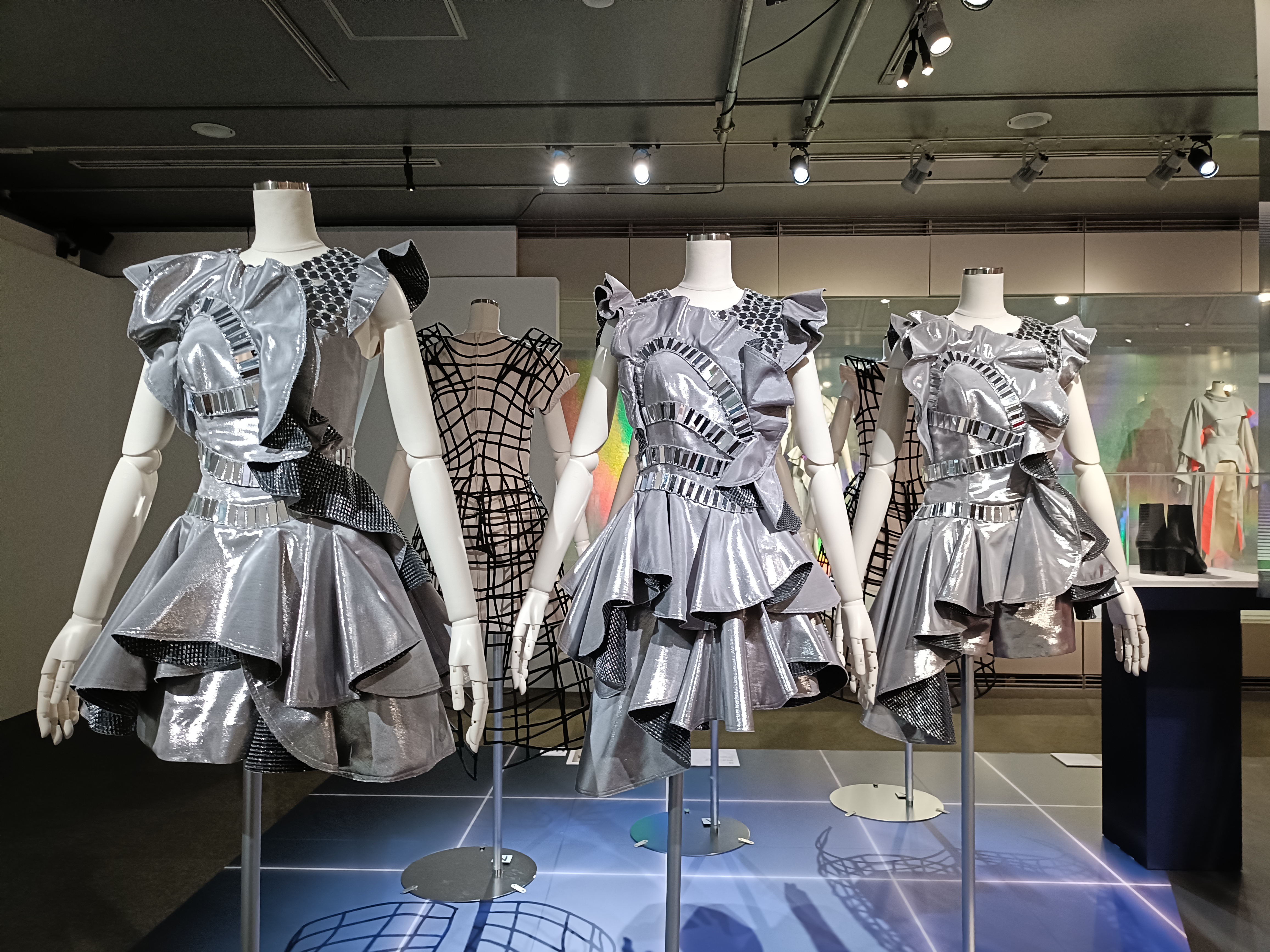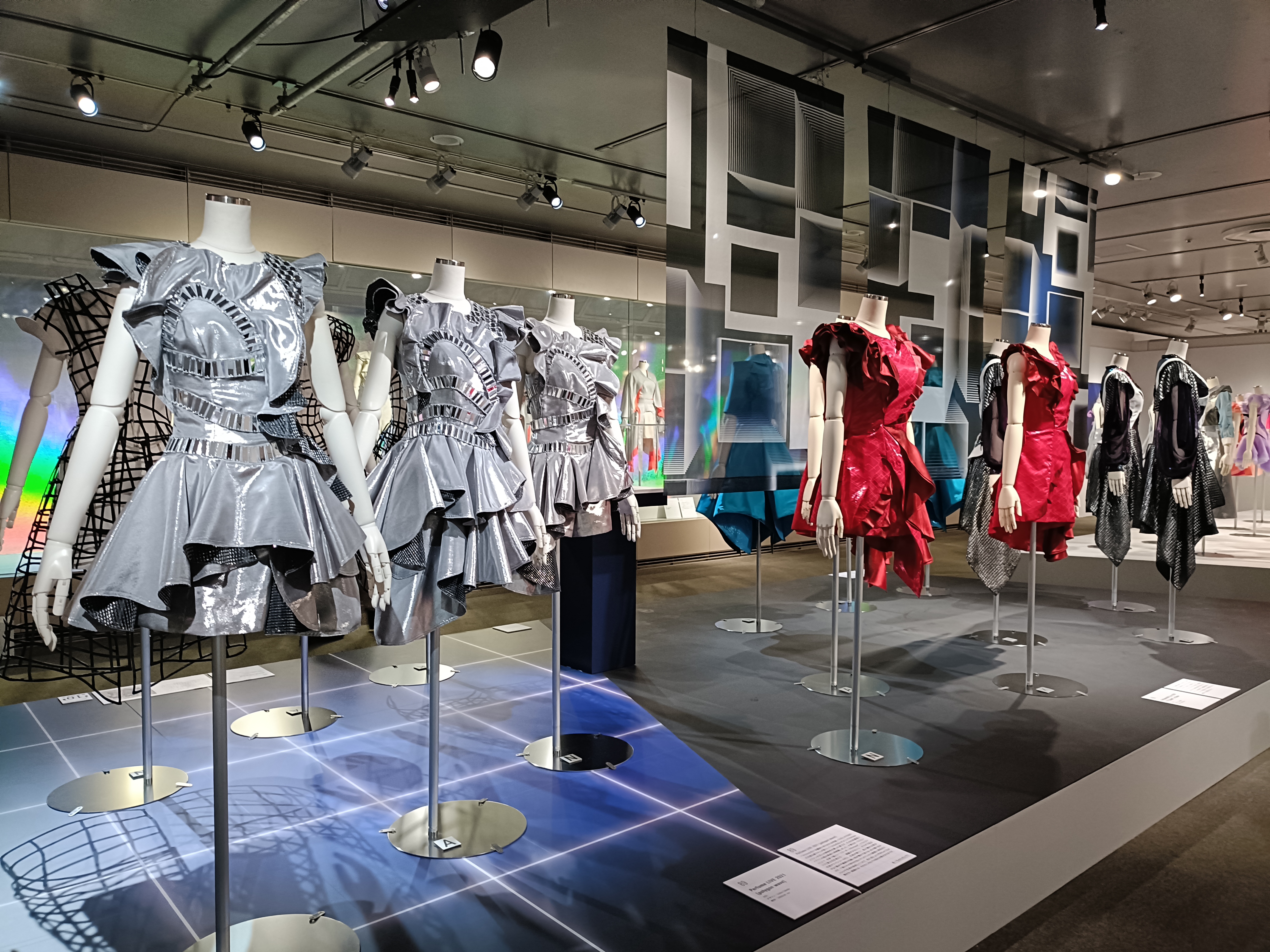 これまでの会場とは異なり、Perfumeの活動を「ライブ」の観点から可視化するべく、展示を刷新し、ライブ・ツアー衣装を中心に構成し直されました 。2008年武道館初公演や2010年東京ドーム初公演など初期の代表的な衣装から、今年9月の東京ドーム公演で着用した衣装まで、約160点が年代順に展示。
