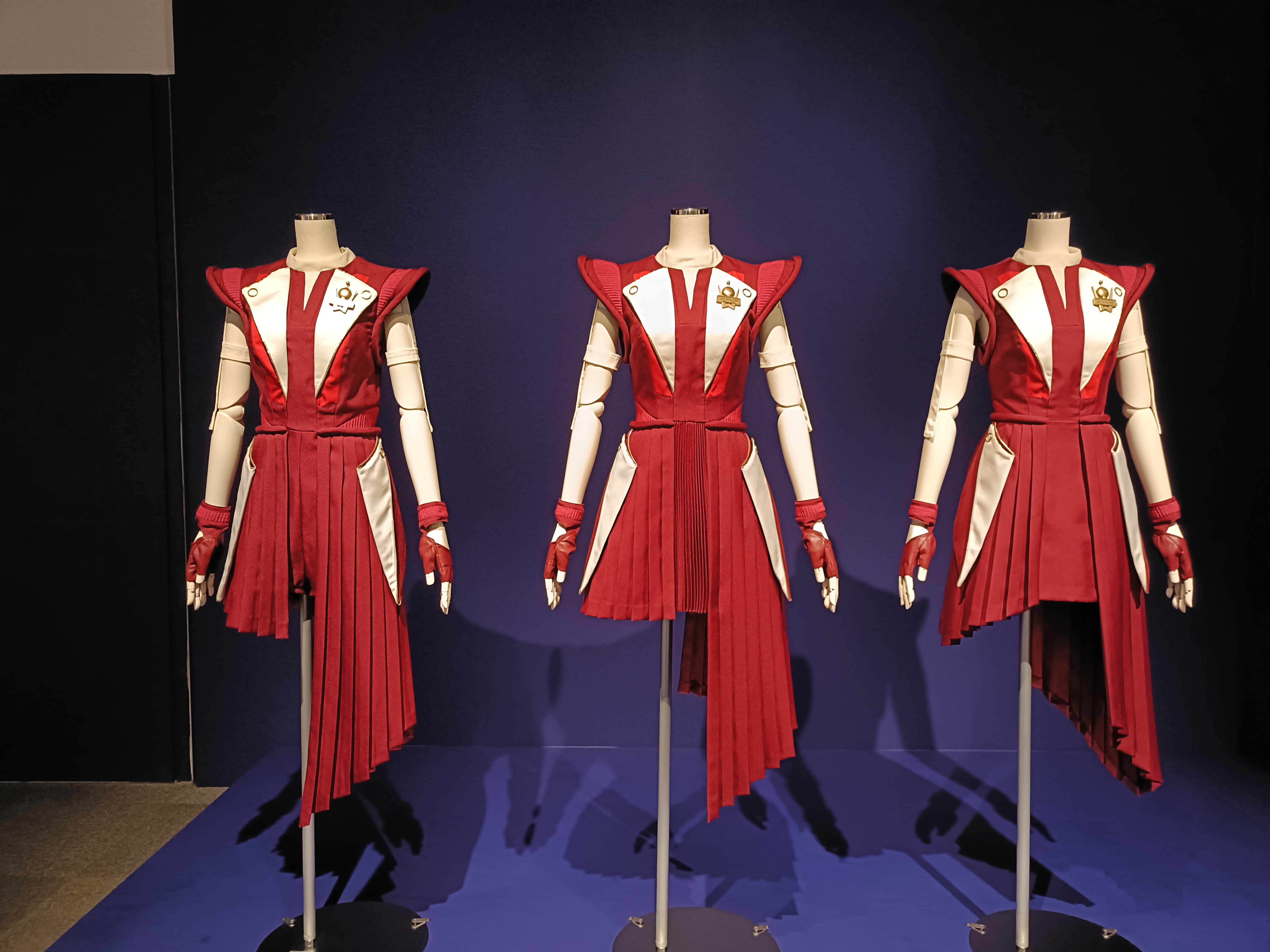 展示では、軍服モチーフの「ネビュラロマンス 前篇」ジャケット衣装と、赤×白にゴールドを差した洗練された「ネビュラロマンス 後篇」ジャケット衣装が並びます。