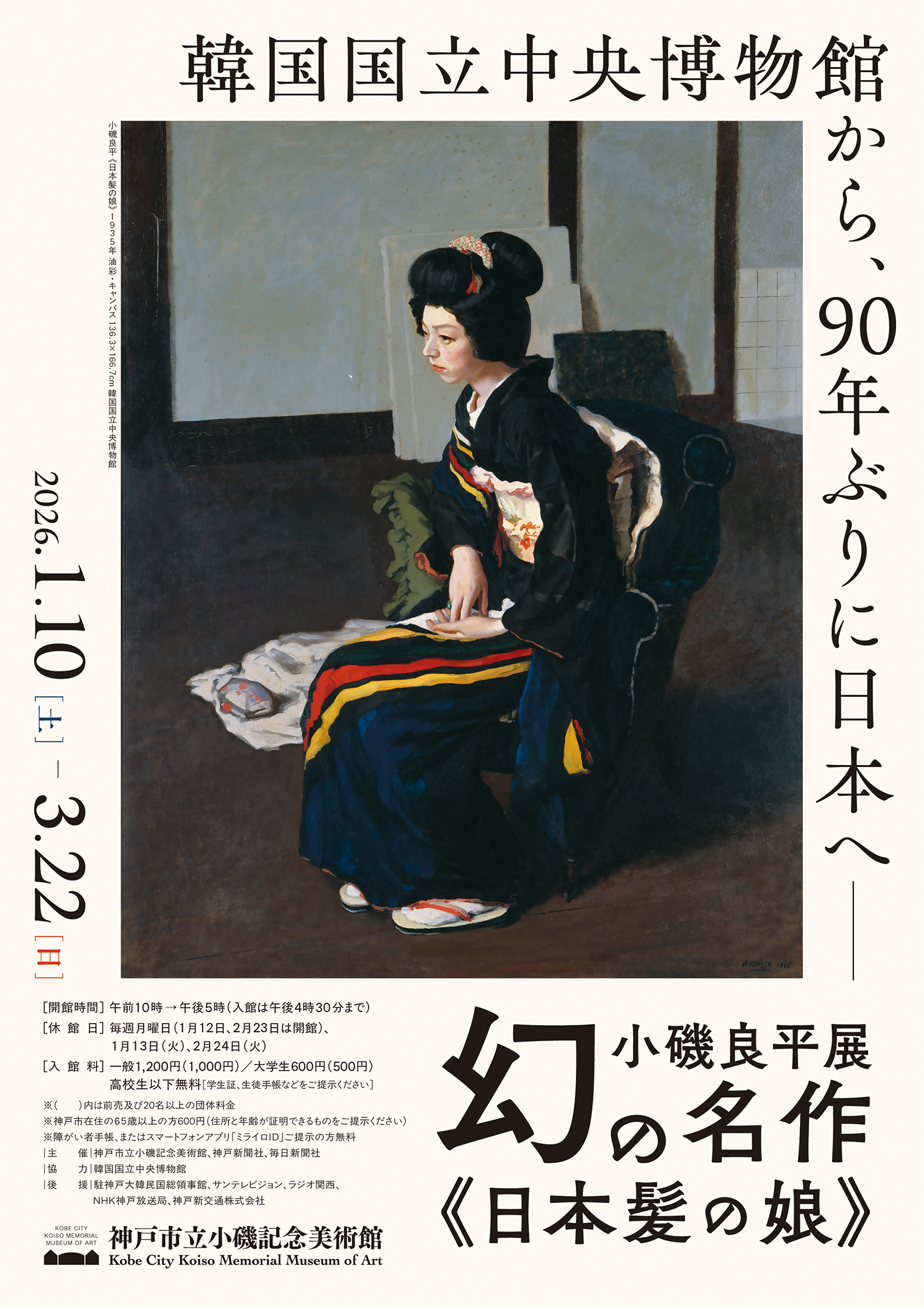 神戸市立小磯記念美術館にて、2026年1月10日(土)から3月22日(日)まで、特別展「小磯良平展――幻の名作《日本髪の娘》」が開催されます。