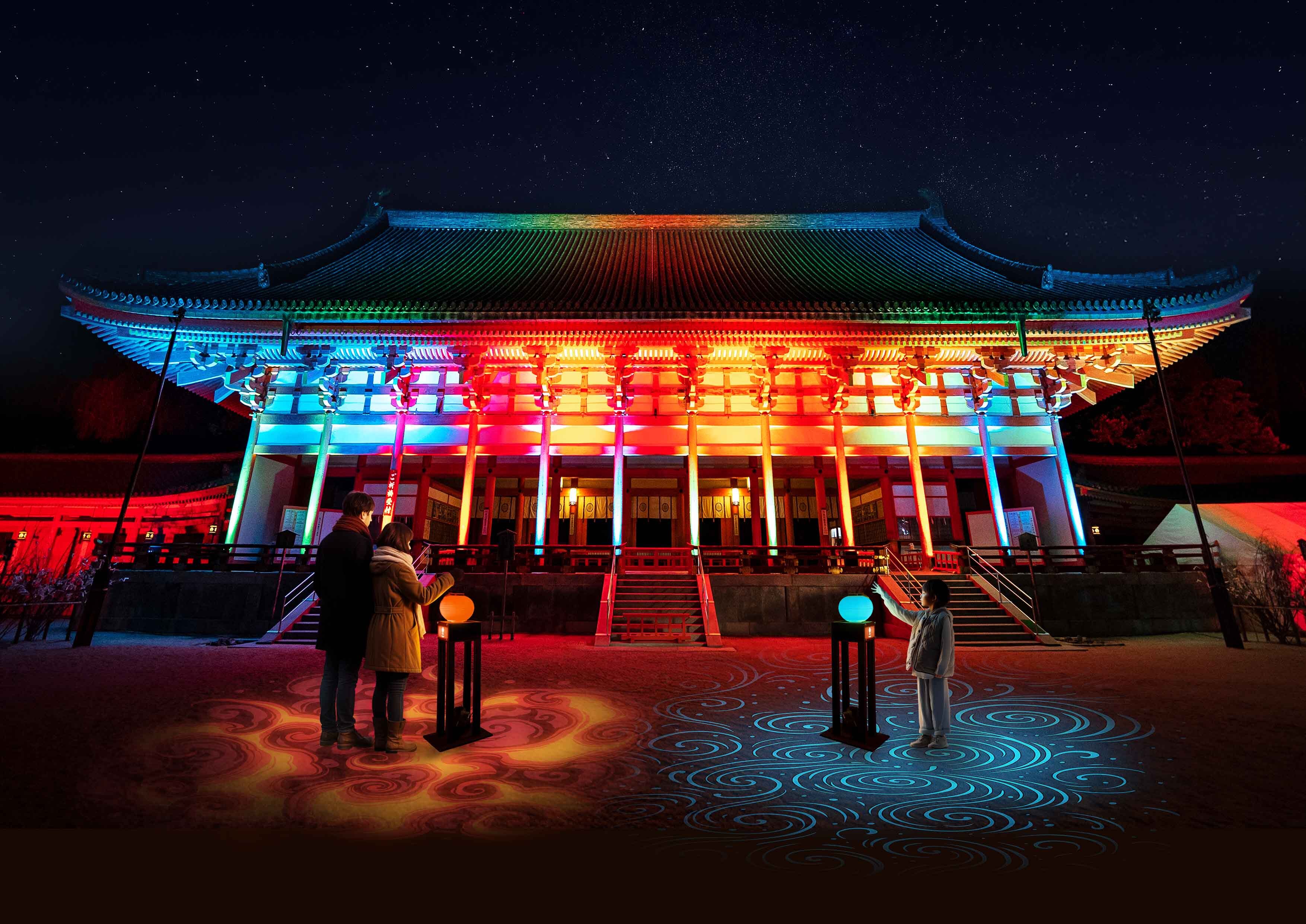 大極殿の前では、手にした提灯の光を社殿に向かって送ることで、四神への祈りを届ける体験ができるインタラクティブアートが待っています。壮麗な社殿が静かに呼応します。その後、荘厳にライトアップされた大極殿の前で、静かな祈りの時間を持つことができます。