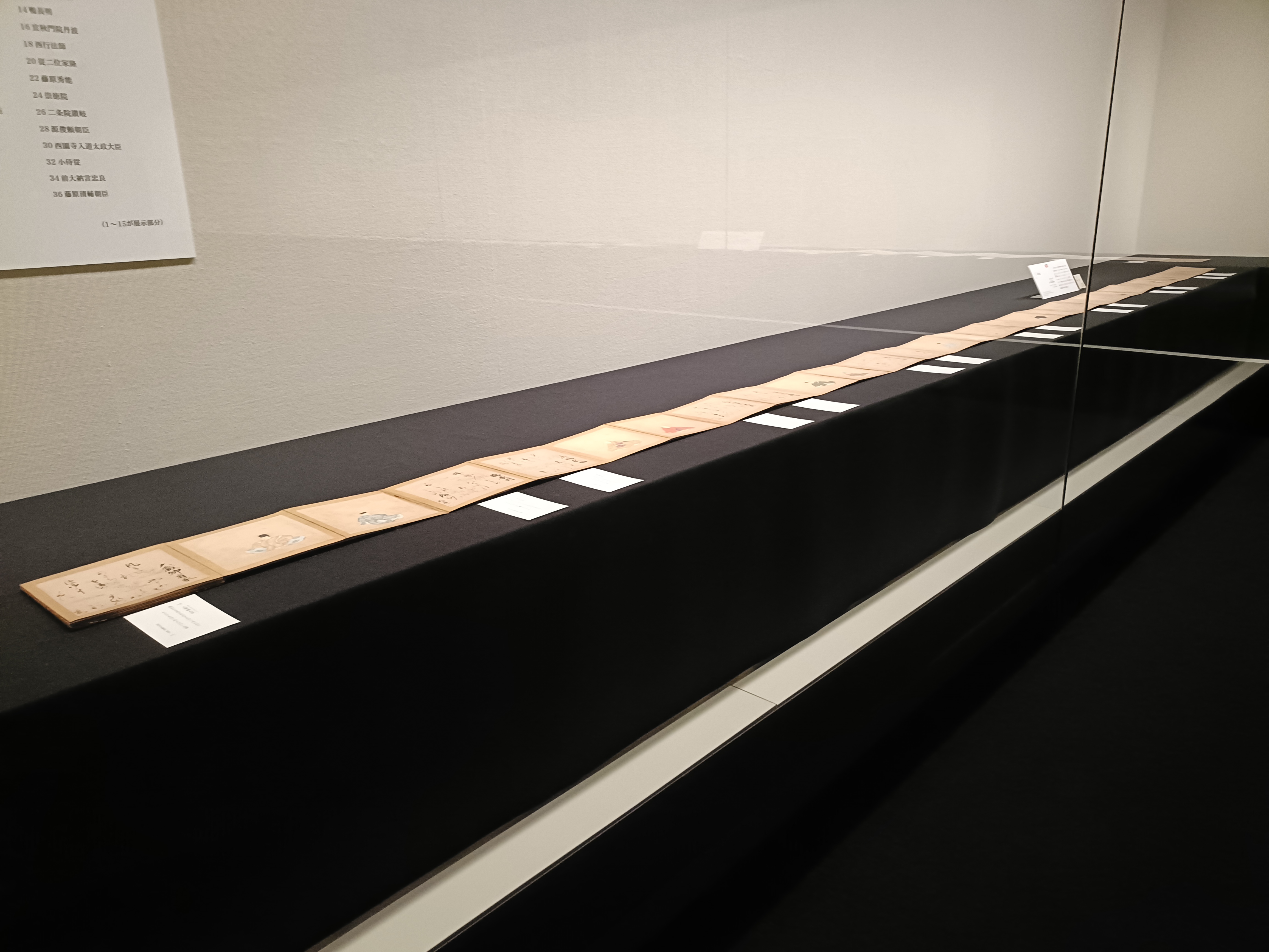 展示室2では、《小倉色紙「うかりける...」》が静かに来館者を迎えます。これは定家が古来の有名な歌人の和歌を1人1首ずつ選び、色紙に書いたもので、百人一首の原点とされてきました。