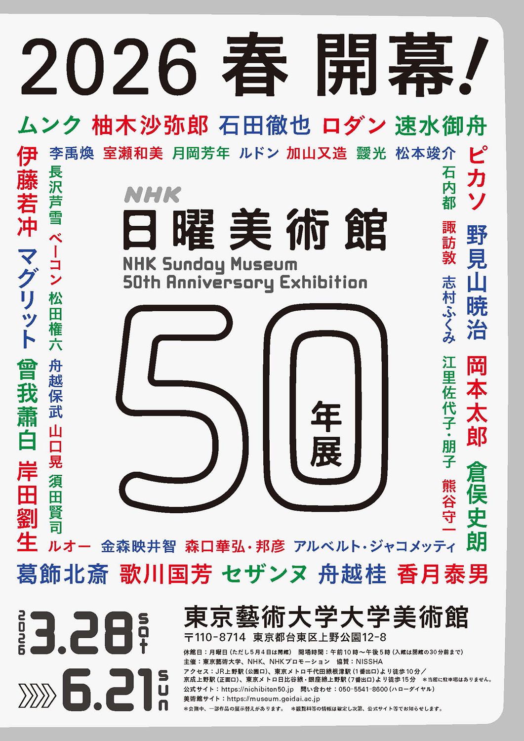 NHK「日曜美術館」は、1976年の放送開始から2500回を超える長寿番組です。2026年に50年を迎えるにあたり、番組が伝えてきた“美”の魅力を紹介する展覧会「NHK日曜美術館50年展」が、2026年3月28日から6月21日まで、東京藝術大学大学美術館で開催されます。