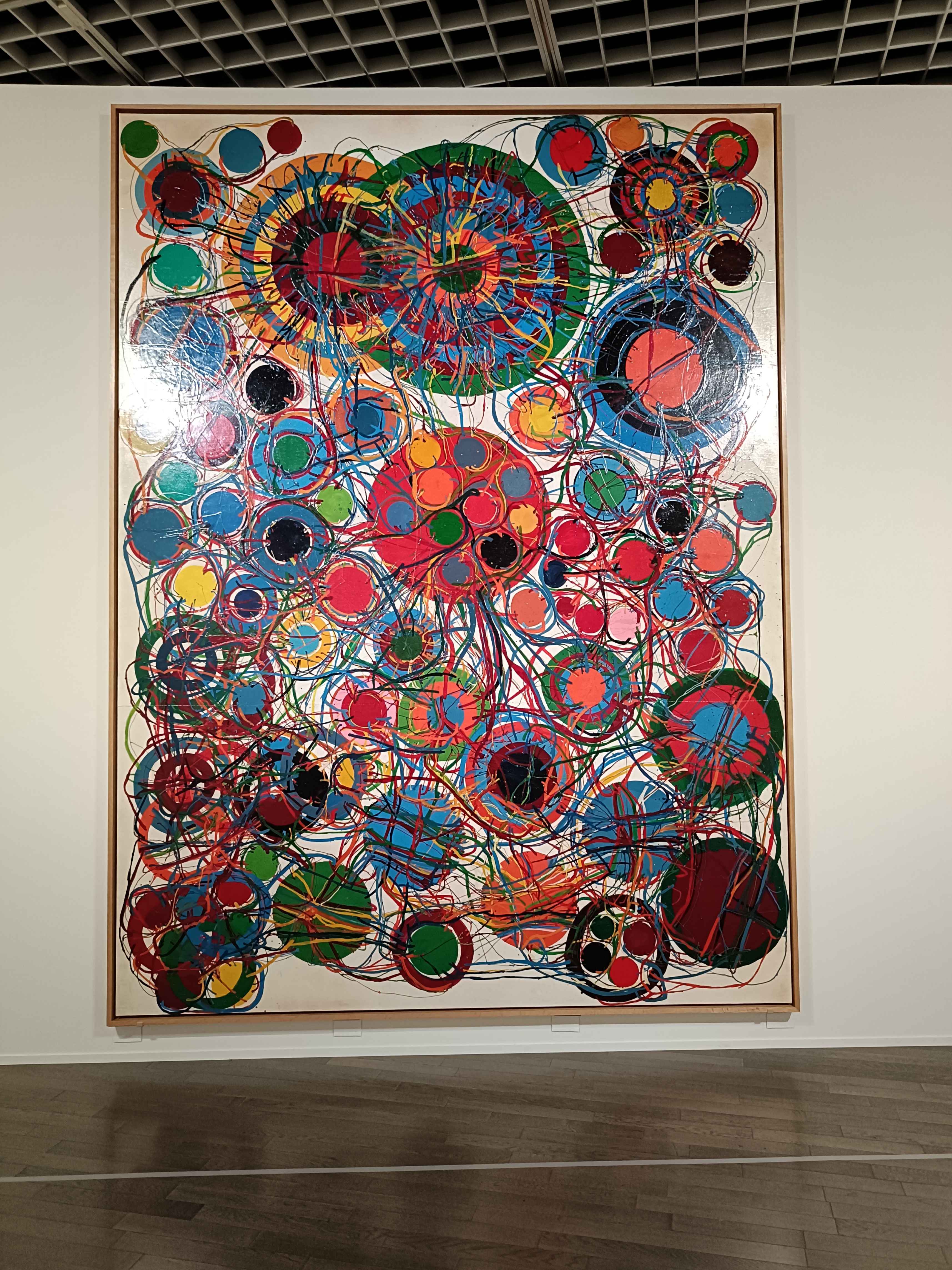 「電気服」で知られる田中敦子(1932-2005)ですが、平面作品においてもその才能は遺憾なく発揮されました。《地獄門》(1965-69)や《Work 1963 B》(1963)のように、合成樹脂塗料を用いた作品群は、無数の円とそれらを繋ぐ線が絡み合い、まるで電気回路や神経網のような複雑な様相を呈しています。
