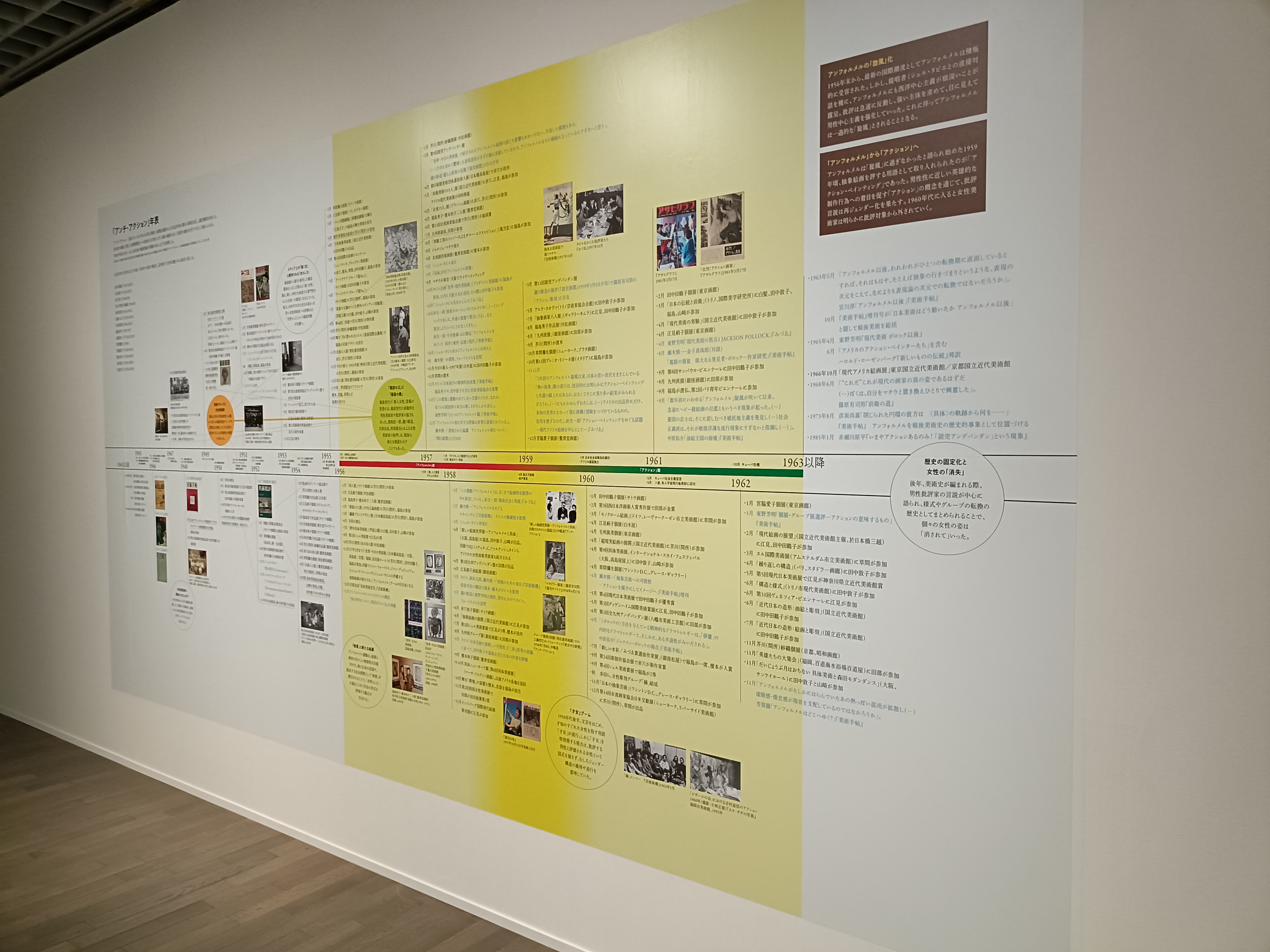 会場では、「アンチ・アクション」のコンセプトを一望できる年表が掲示されているほか、本展に関わる様々なトピックを紹介するガイドも配布されています。これらを手がかりにすることで、個々の作品の魅力だけでなく、作家たちが生きた時代の空気や、彼女たちが直面した課題を多面的に理解することができるでしょう。
