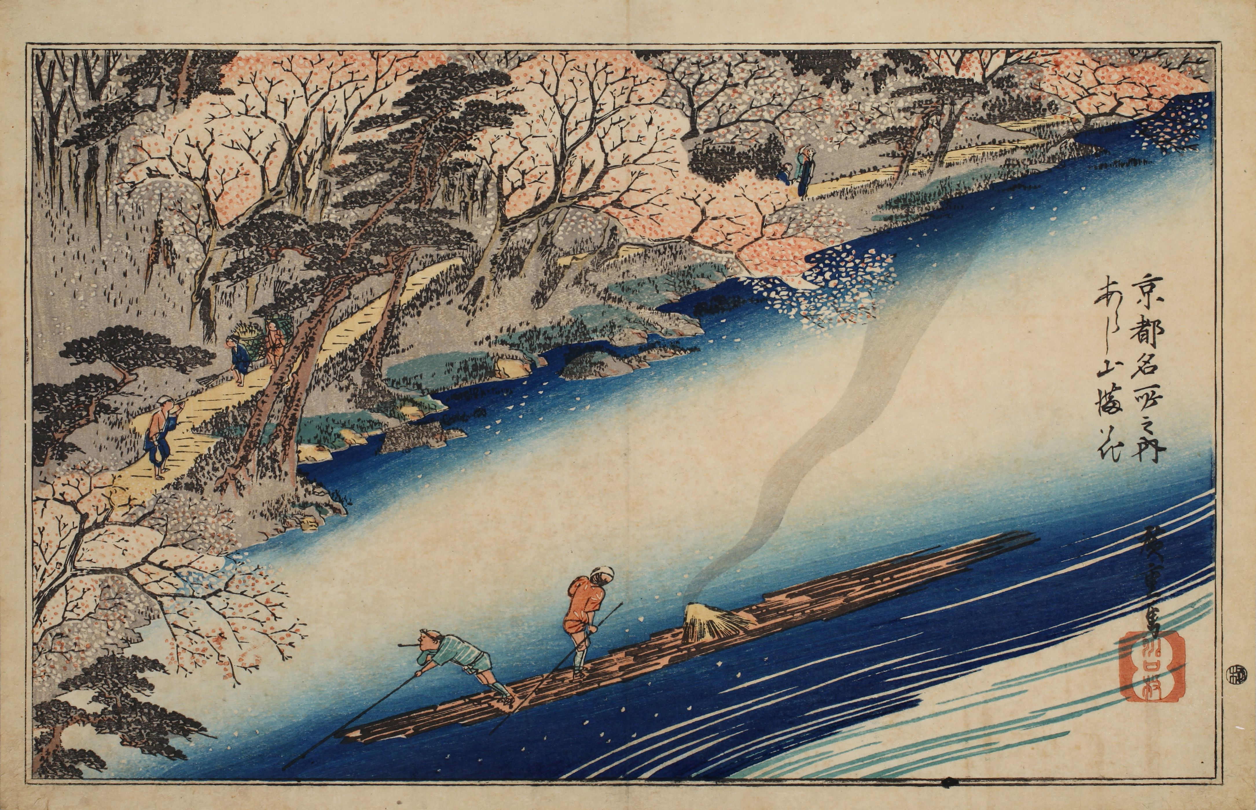 《武陽金沢八勝夜景》立体感と静けさを見事に表現した逸品です。さらに、京都・嵐山の春の風景と市井の人々の息遣いが伝わる《京都名所之内 あらし山満花》、広重の十八番である夜景と雨を美しく描いた《東海道五拾三次之内 沼津 黄昏図》など、穏やかな色彩感覚で季節の移り変わりや天候を表現した広重の世界が広がります。